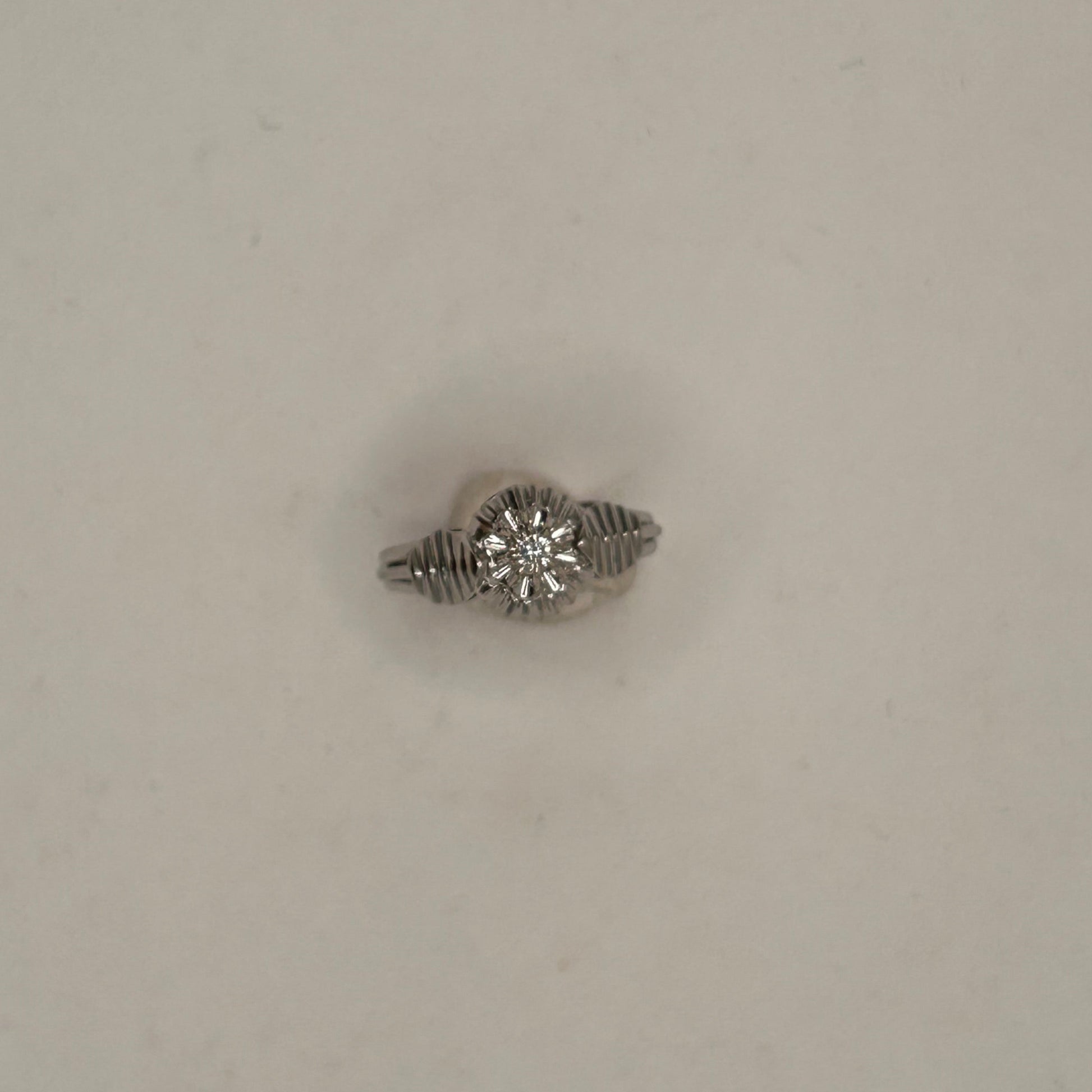 Cette bague solitaire en or blanc 18 carats (3,43 g) est sertie d’un diamant de 0,05 carats, apportant brillance et sophistication. Taille 53, très bon état, parfaite pour un bijou quotidien ou un cadeau précieux.