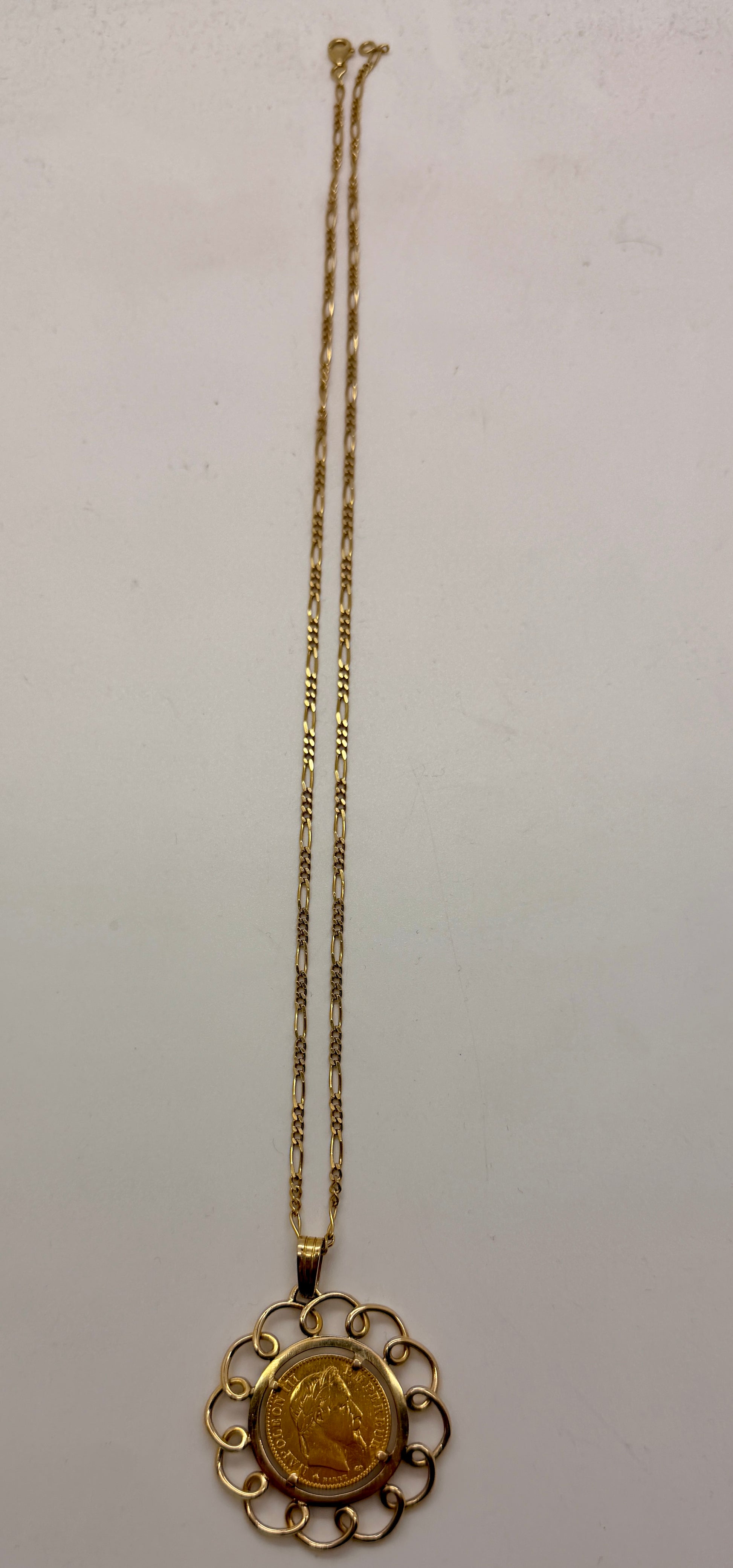 Collier matinée en or jaune 750/1000, maille figaro, fermoir mousqueton, poinçon 750, poids 16,30 g, longueur 50 cm, largeur 2 mm, épaisseur 2 mm, orné d’une pièce de 10 FRS, très bon état.