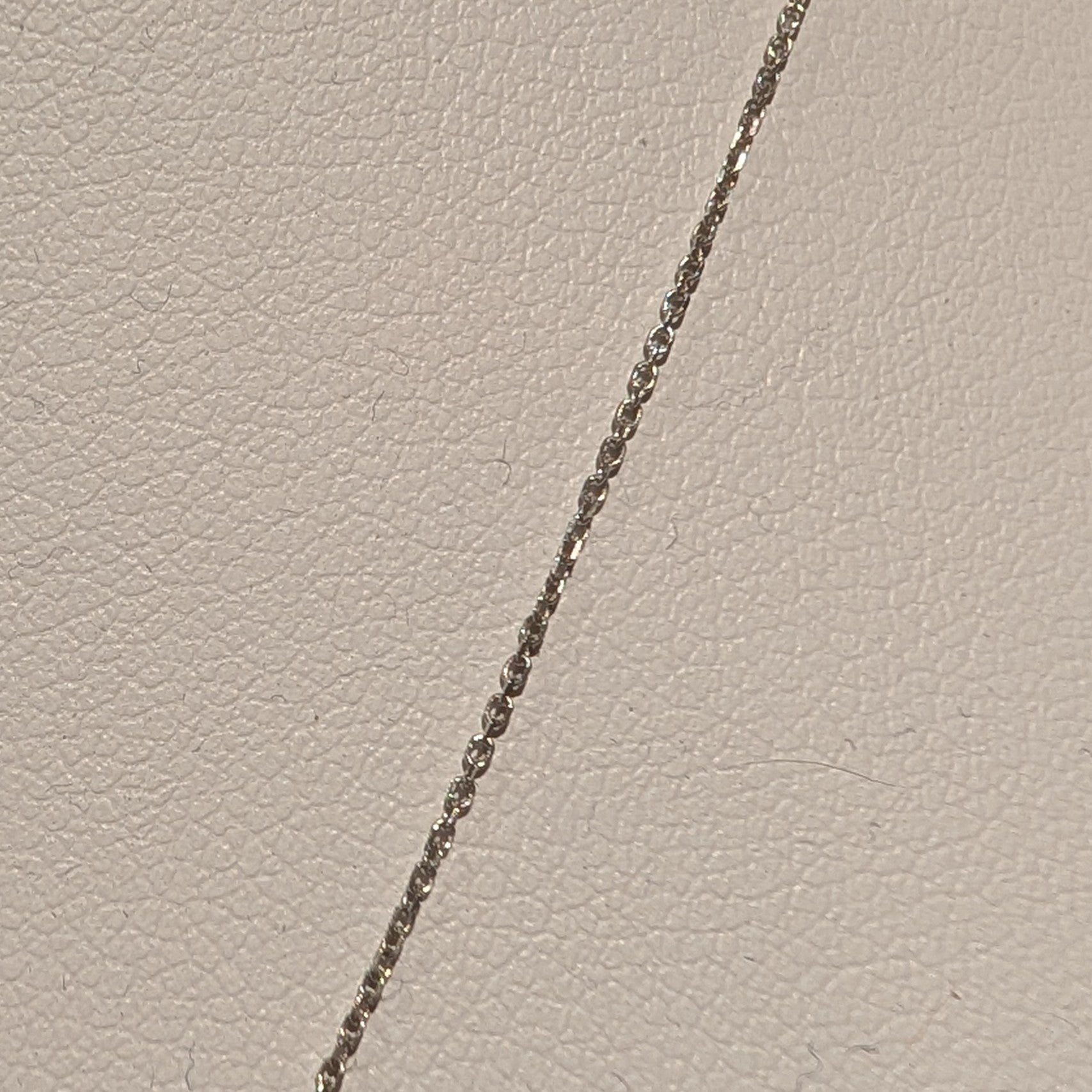 Collier princesse en or blanc 750/1000, maille forçat, fermoir à anneau ressort, poinçon 750, poids 2,70 g, longueur 40 cm, largeur 0,5 cm, épaisseur 0,5 cm, orné d’une perle naturelle et de 17 éclats de diamant, très bon état.