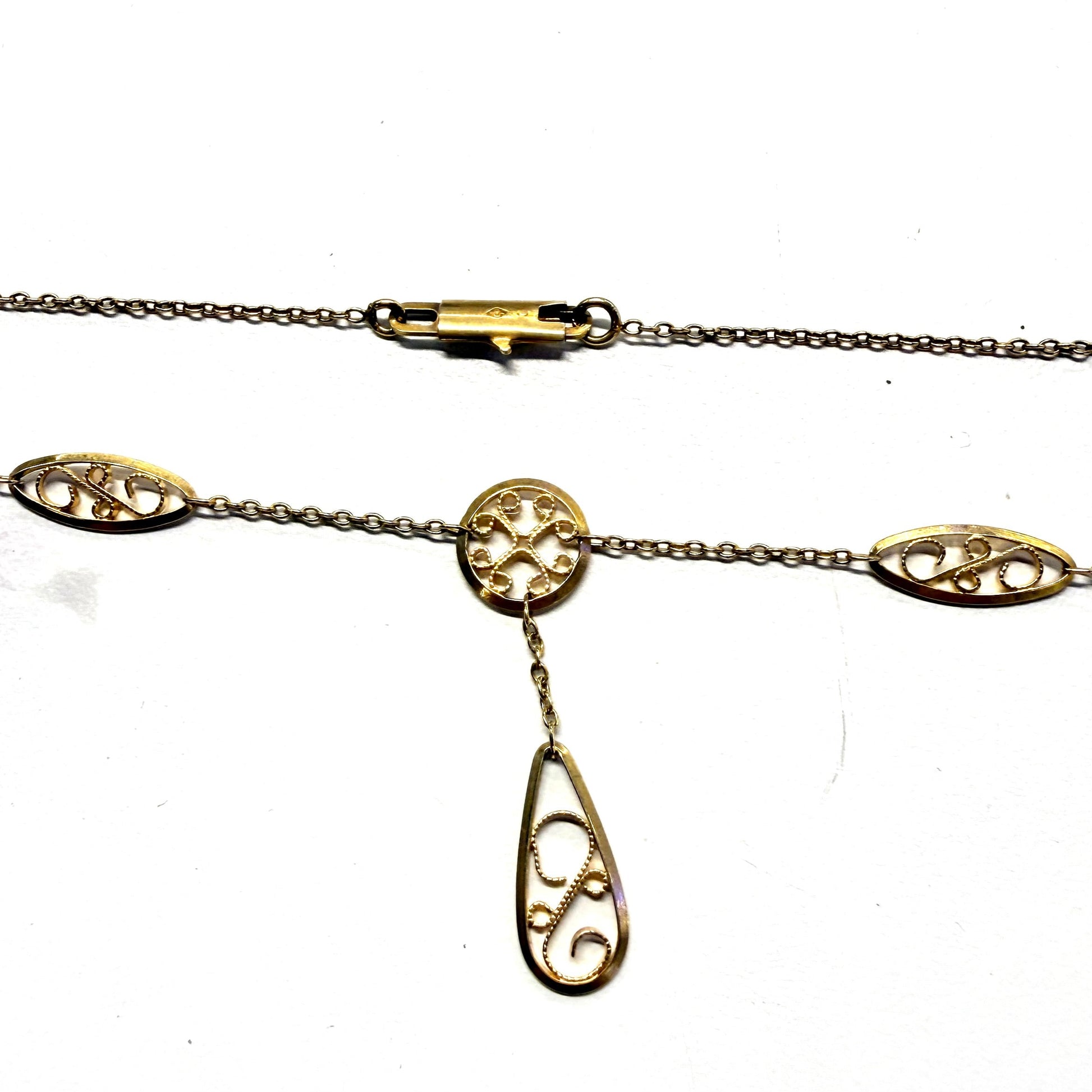 Collier ras du cou en or jaune 750/1000 (18 carats), maille filigrane, poinçonné tête d’aigle. Fermoir mousqueton. Longueur : 50 cm, largeur : 5 mm, épaisseur : 1 mm. Poids : 4,24 g. Très bon état.