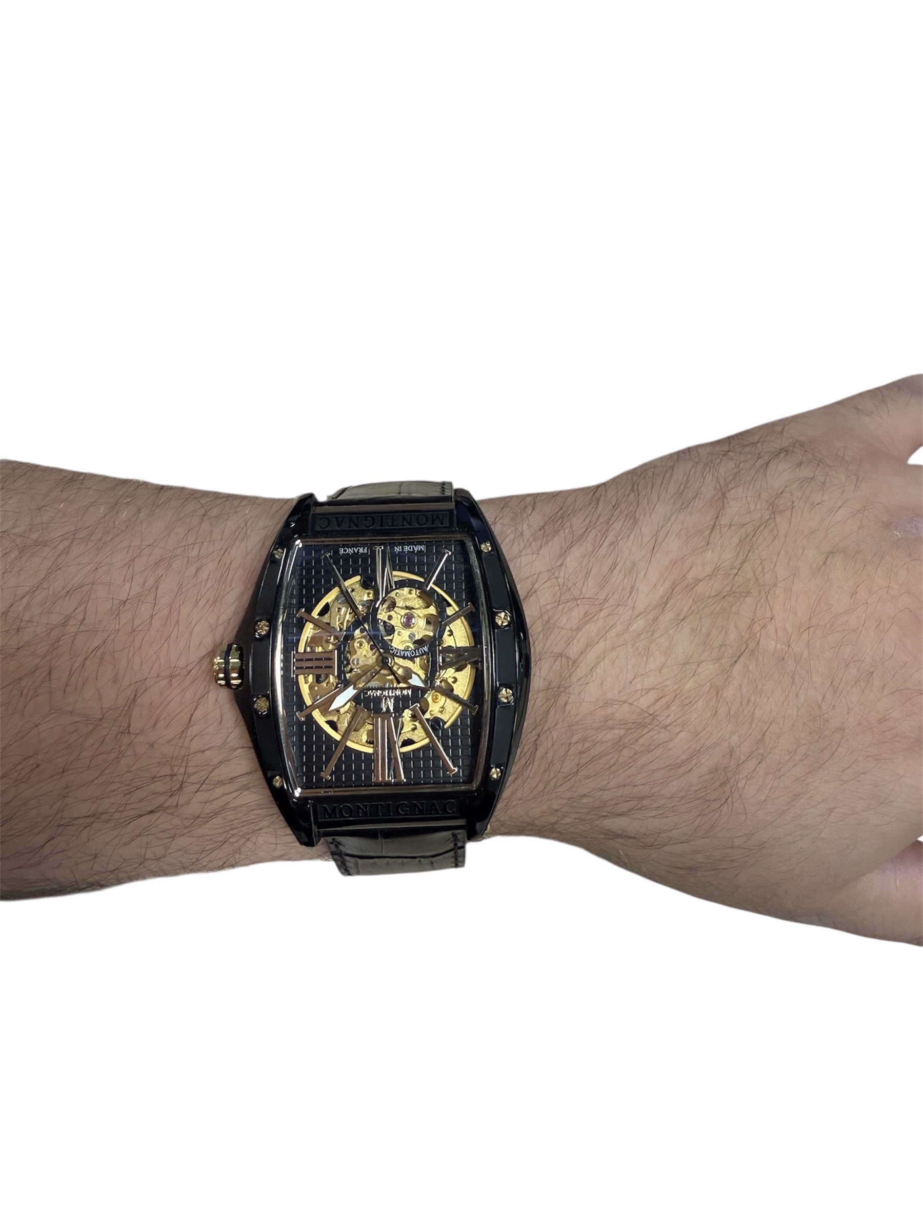 Montre Montignac Toneau – Automatique – SqueletteModèle squelette moderne avec boîtier en acier noir de 47 mm, cette montre Montignac de 2024 dispose d’un mouvement automatique, d’un verre minéral et d’un bracelet en cuir avec boucle ardillon. État comme neuf.