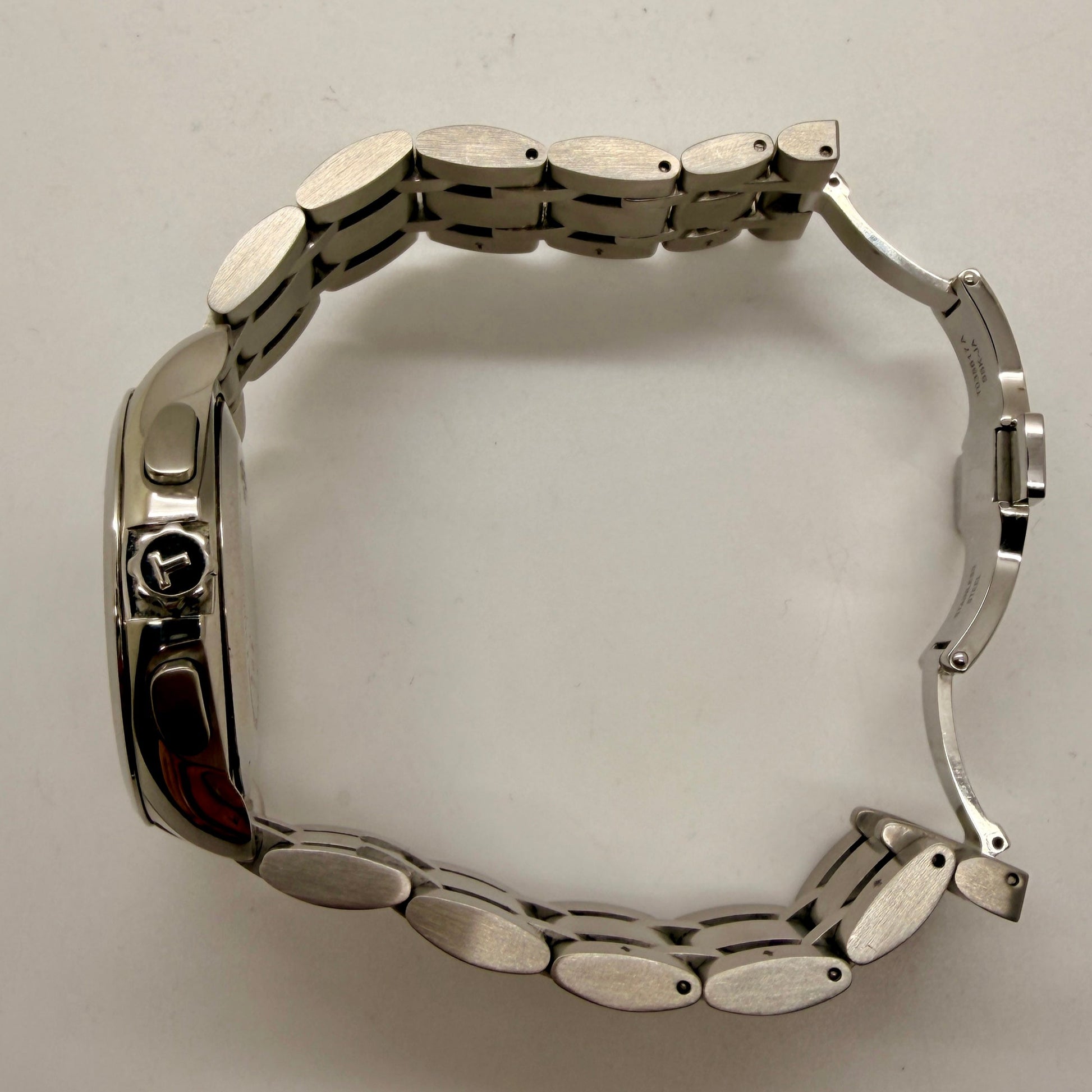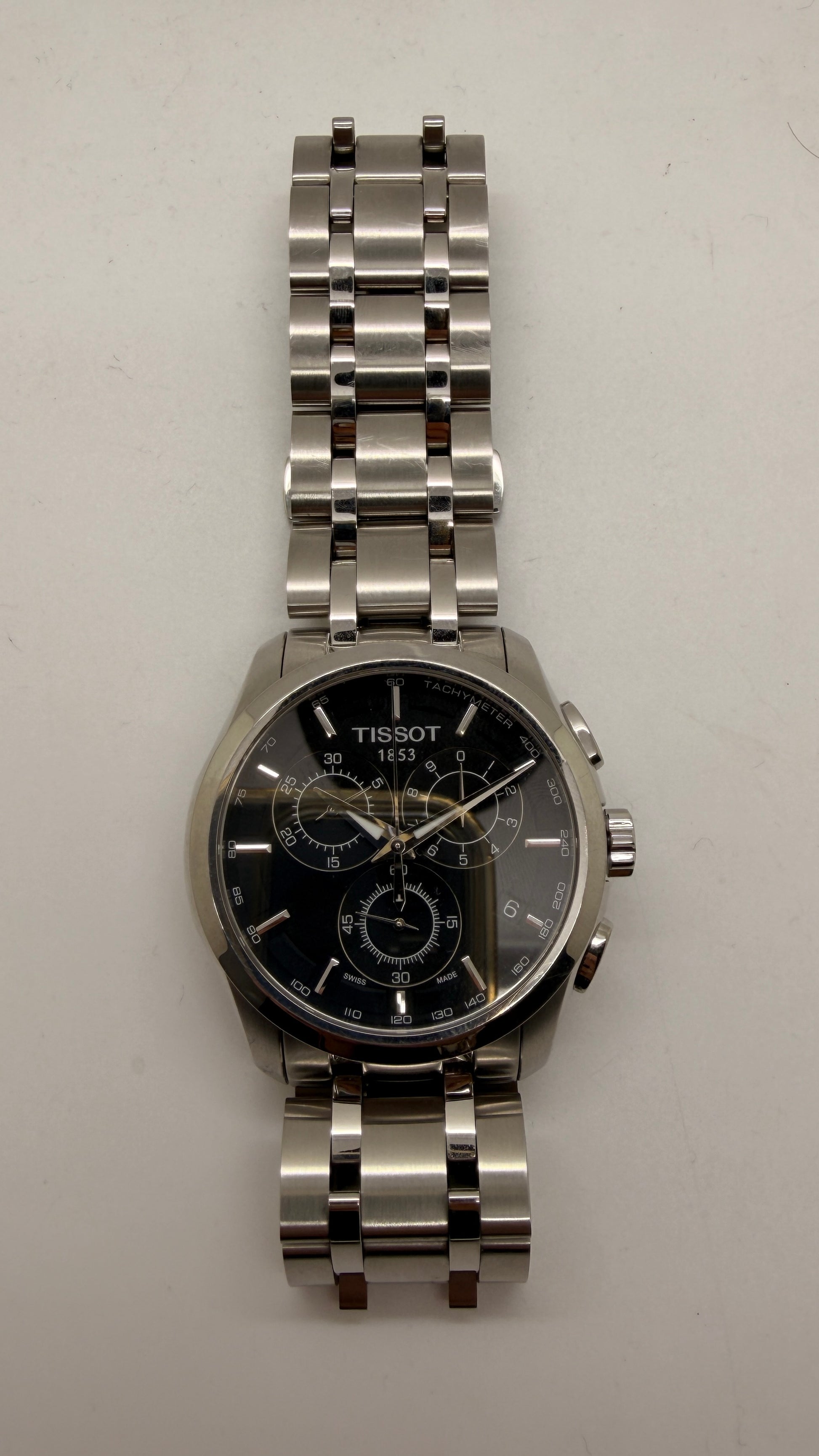 Montre Tissot Couturier Chronographe pour homme, modèle 2024, en état comme neuve. Elle dispose d’un mouvement quartz, d’un boîtier en acier argenté de 41 mm, protégé par un verre saphir.