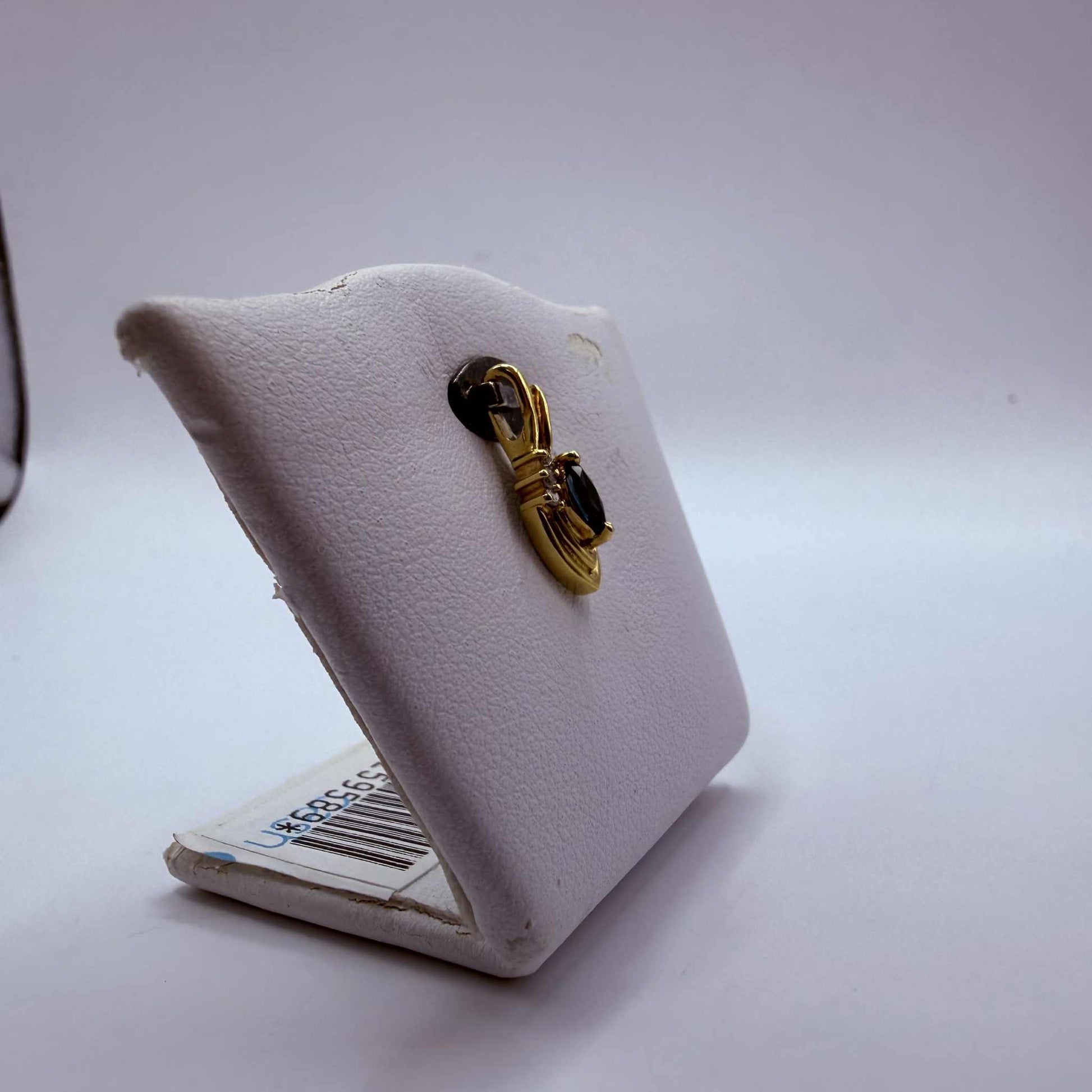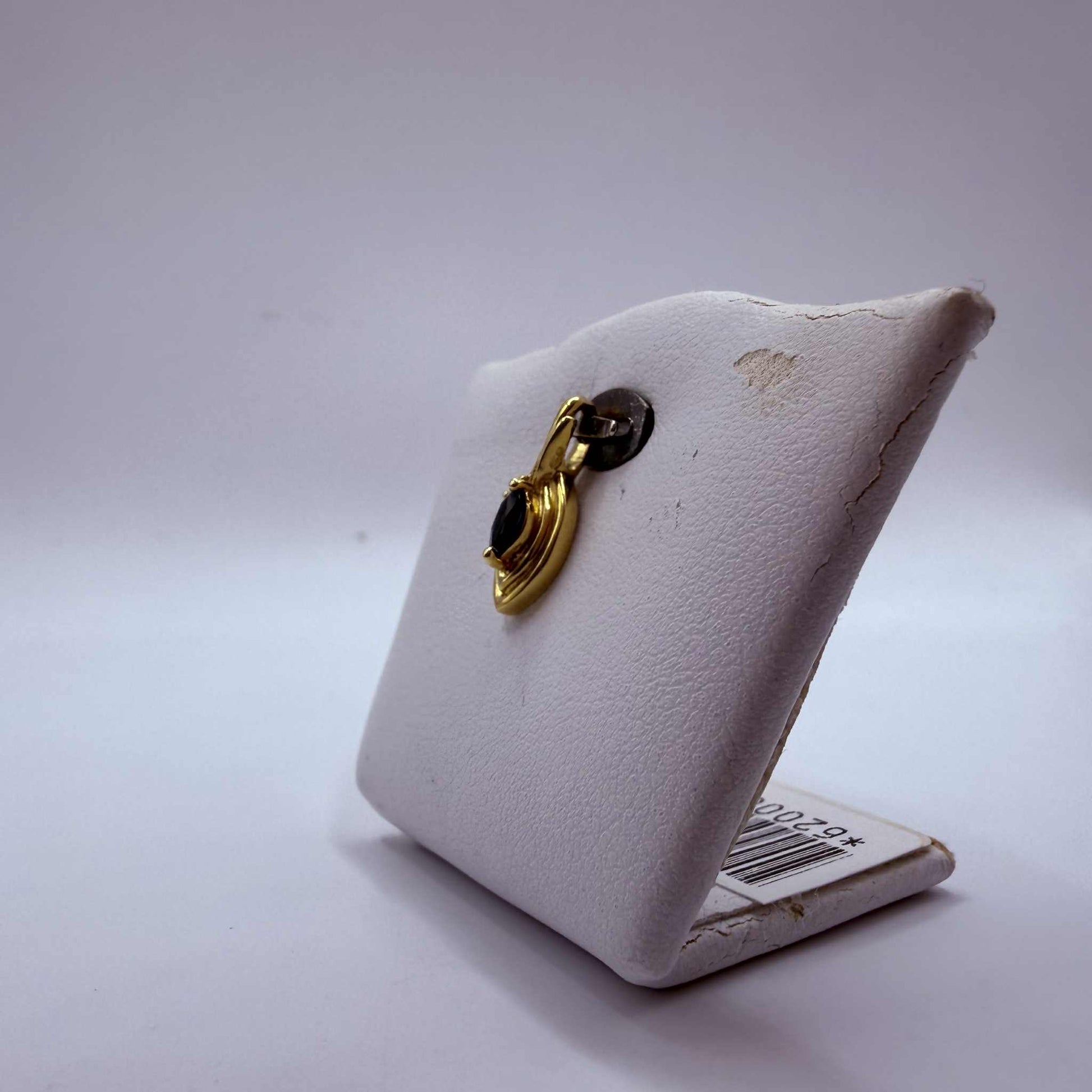 Pendentif solitaire en or jaune 18 carats (750/1000), poinçonné 750. Il mesure 1,5 cm de hauteur, 6 mm de largeur et 5 mm d’épaisseur, pour un poids de 0,99 gramme. Sertie de diamants. Bon état.