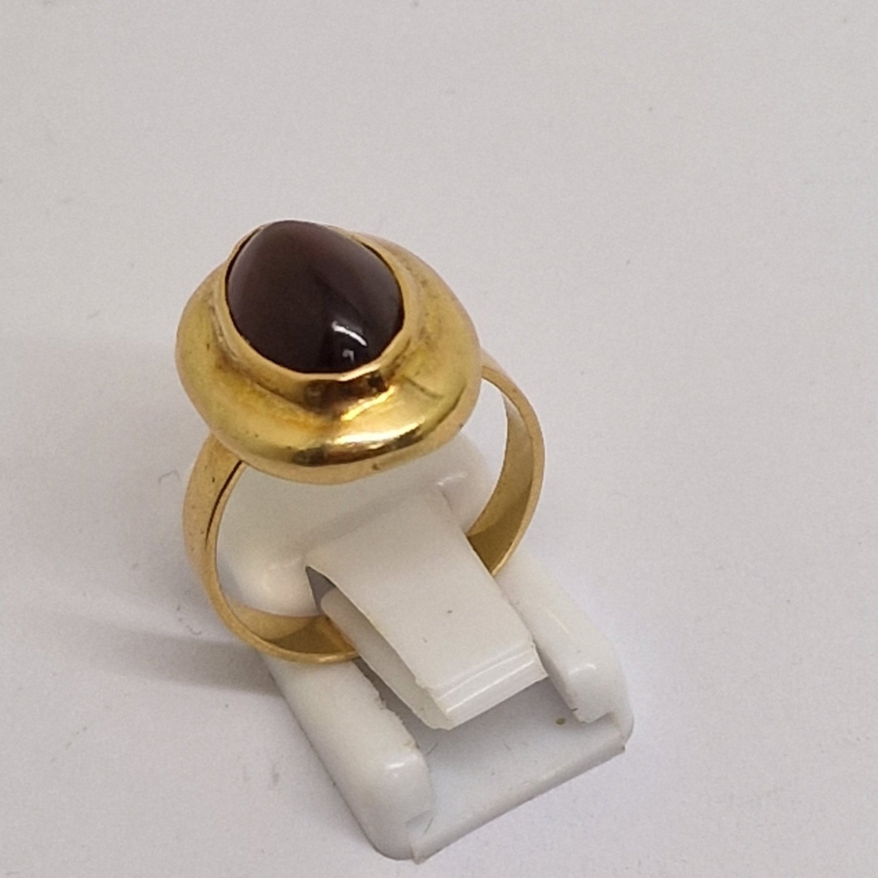 Bague ancienne en or jaune 18 carats, poinçon tête d’aigle. Taille 53, poids 5,23 g, sertie d’un grenat, en bon état.