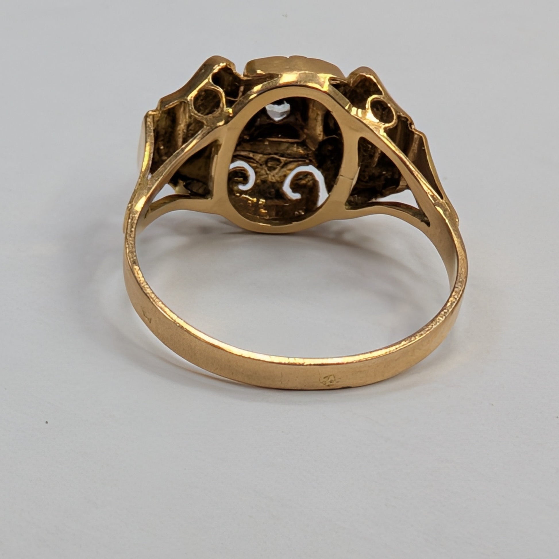 Bague empierrée ancienne en or jaune 18 carats (750/1000), poinçonnée tête d’aigle. Sertie d’un diamant de 0,05 carat. Poids : 2,80 grammes. Taille 55. Très bon état.