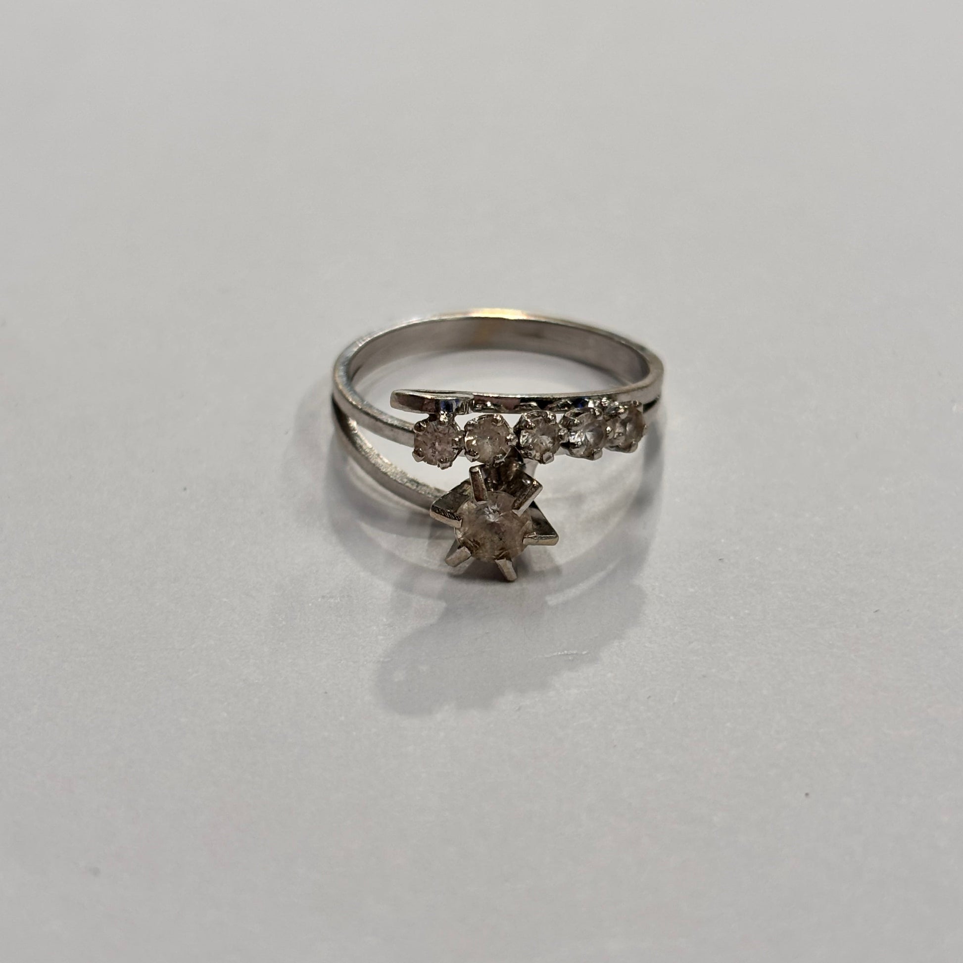 Bague empierrée en or blanc 18 carats (750/1000), poinçonnée à la tête d’aigle, sertie de six oxydes de zirconium. Elle pèse 2,49 grammes et correspond à une taille 51 mm. Présentée en très bon état général.