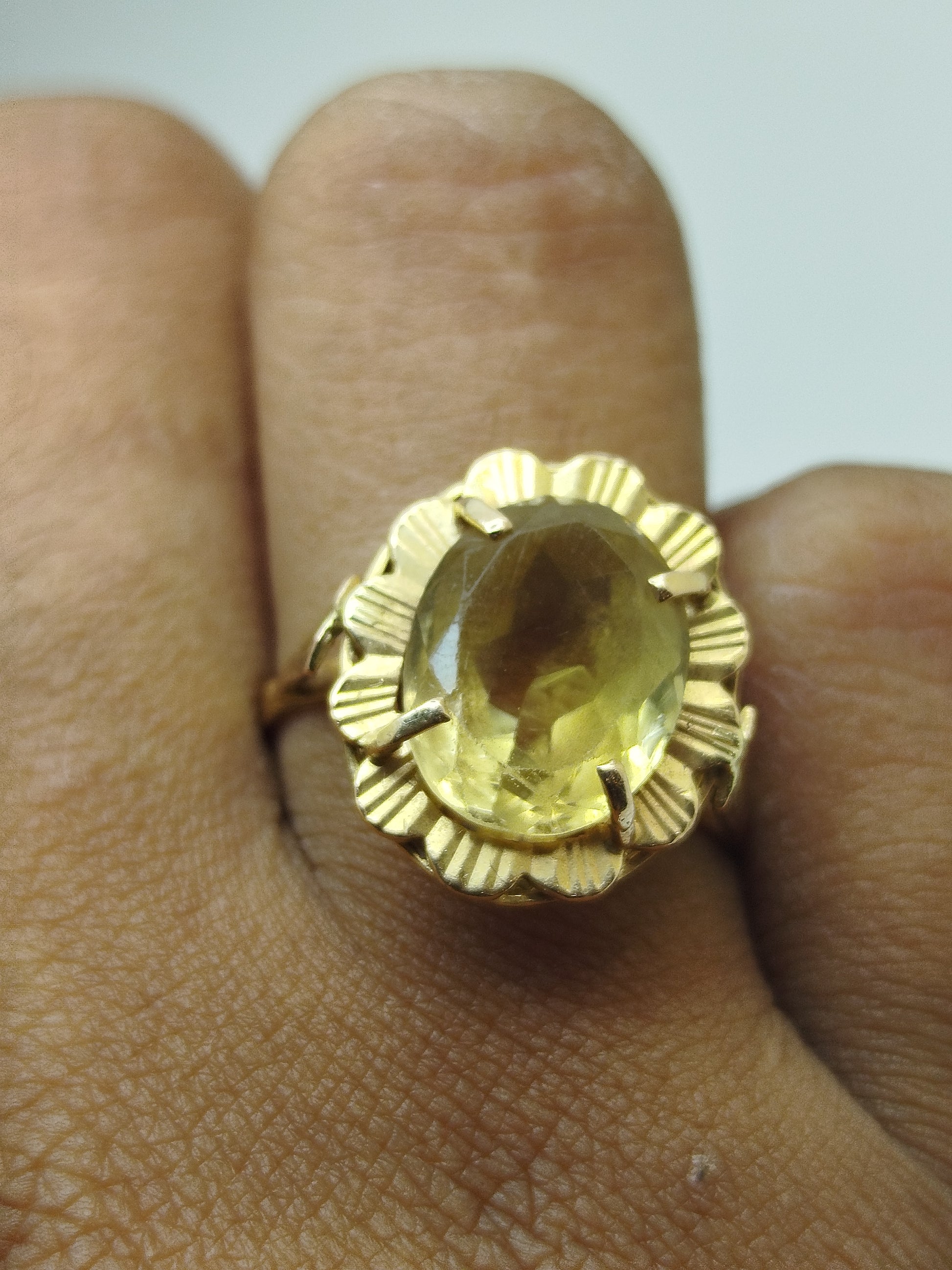 Bague empierrée en or jaune 18 carats (750/1000), sans poinçon. Sertie d’une citrine naturelle lumineuse, poids 3,48 g, taille : 57. En bon état.