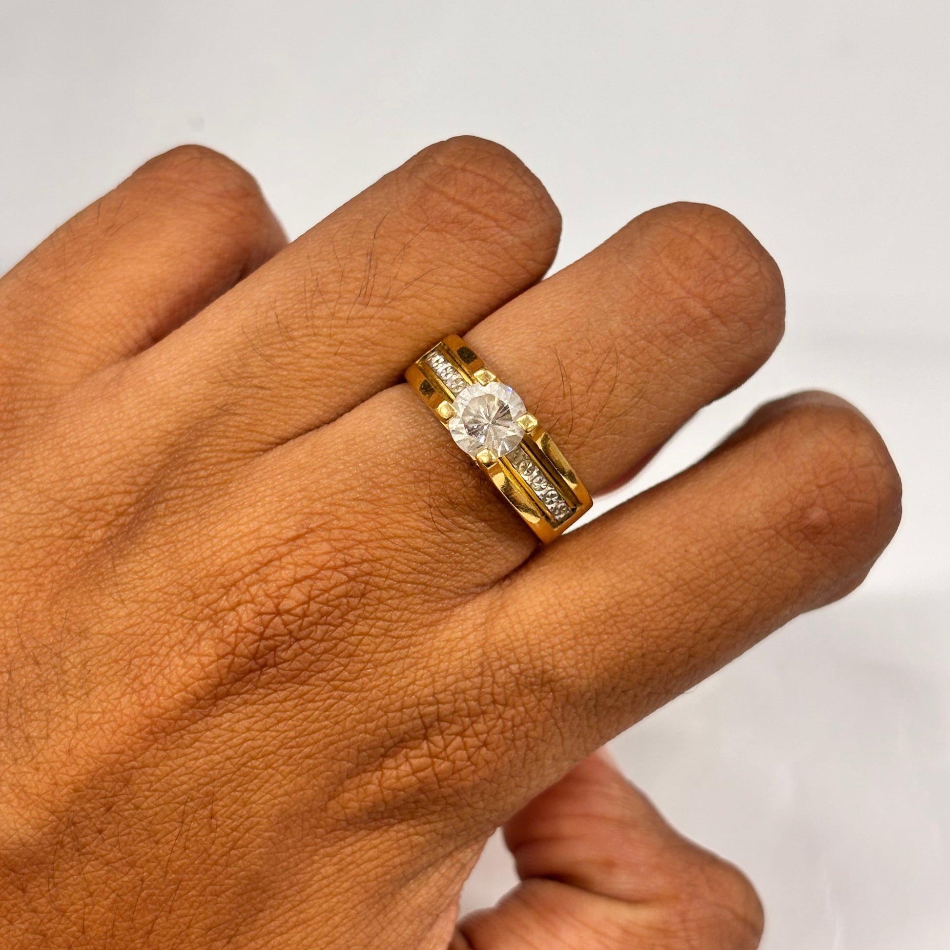 Bague empierrée en or jaune et or blanc 18 carats (750/1000), poinçonnée à la tête d’aigle, ornée d’un oxyde de zirconium. Elle pèse 6 grammes et correspond à une taille 54 mm. Présentée en très bon état général.