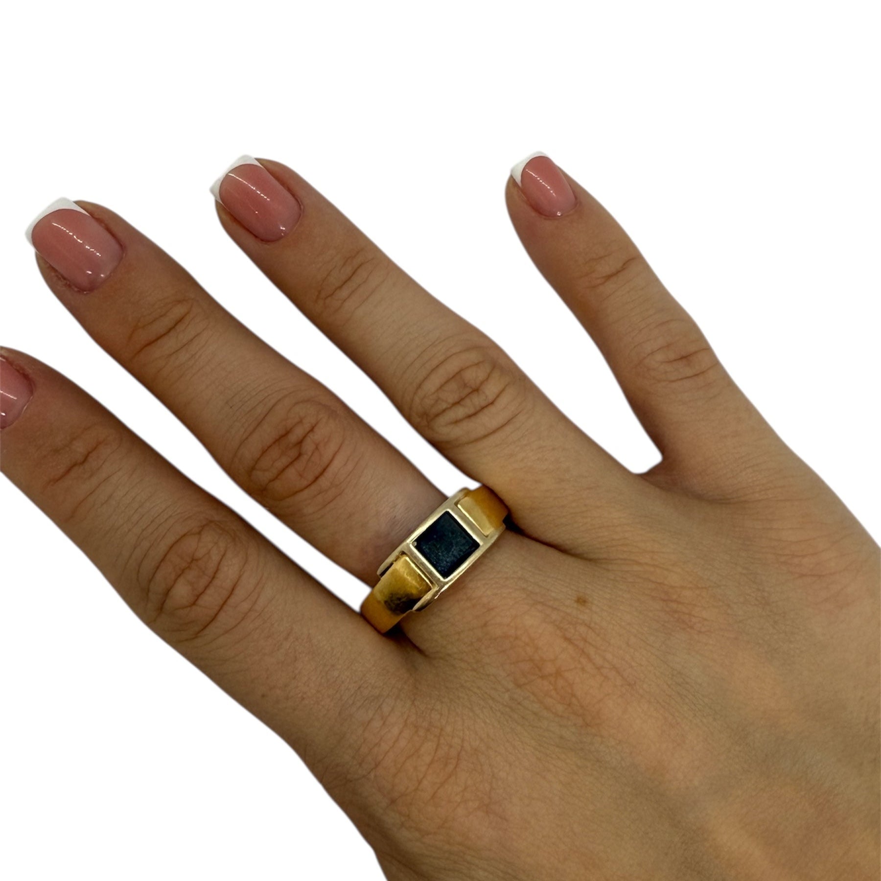 Bague empierrée en or jaune 18 carats (750/1000), sans poinçon. Sertie d’un onyx. Poids : 6,47 grammes. Taille 62. Bon état.