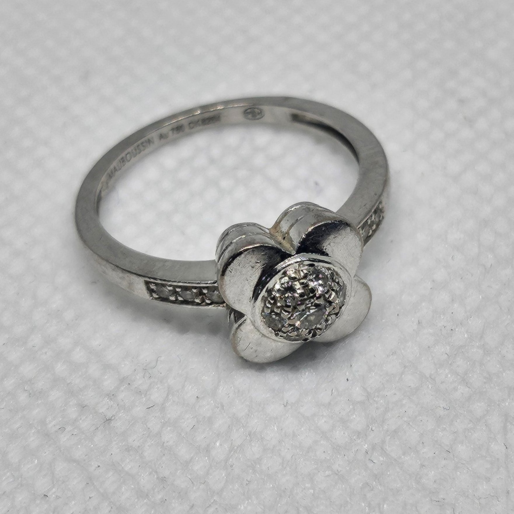 Bague solitaire empierrée en or gris 18 carats, poinçon tête d’aigle. Taille 52, poids 3,46 g, sertie de 6 diamants, en bon état.