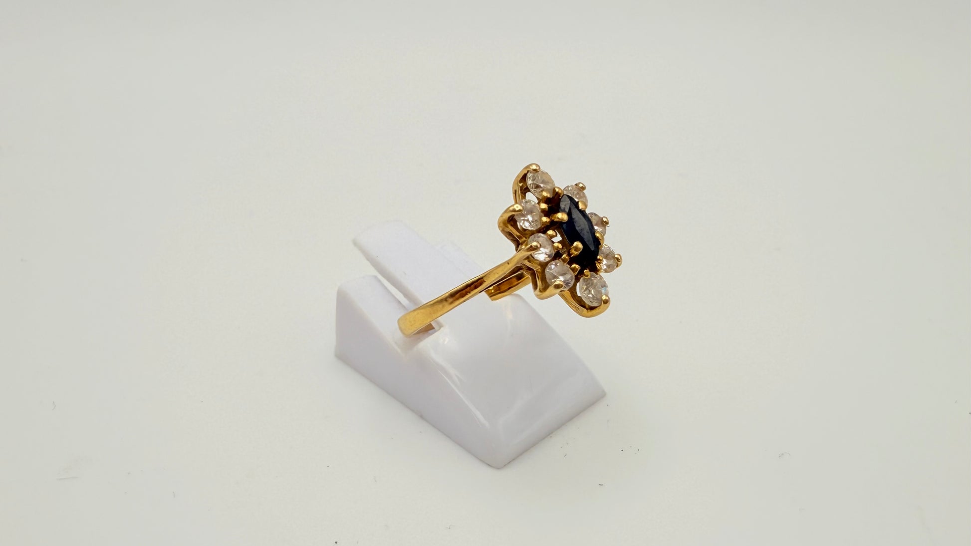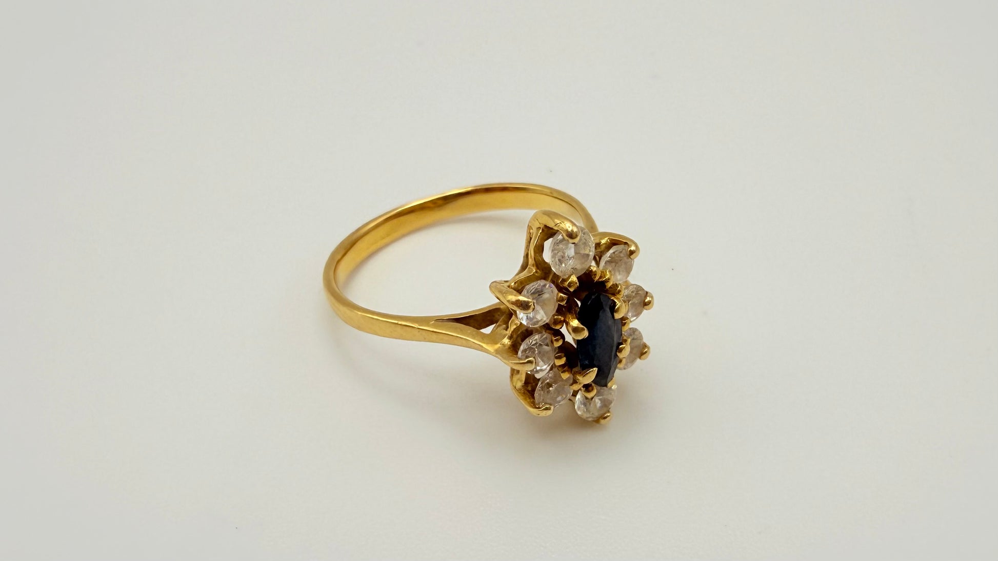 Bague empierrée en or jaune 18 carats (poinçon tête d’aigle 750/1000), sertie de 9 oxydes de zirconium, taille 50, poids 3,08 g. Très bon état.
