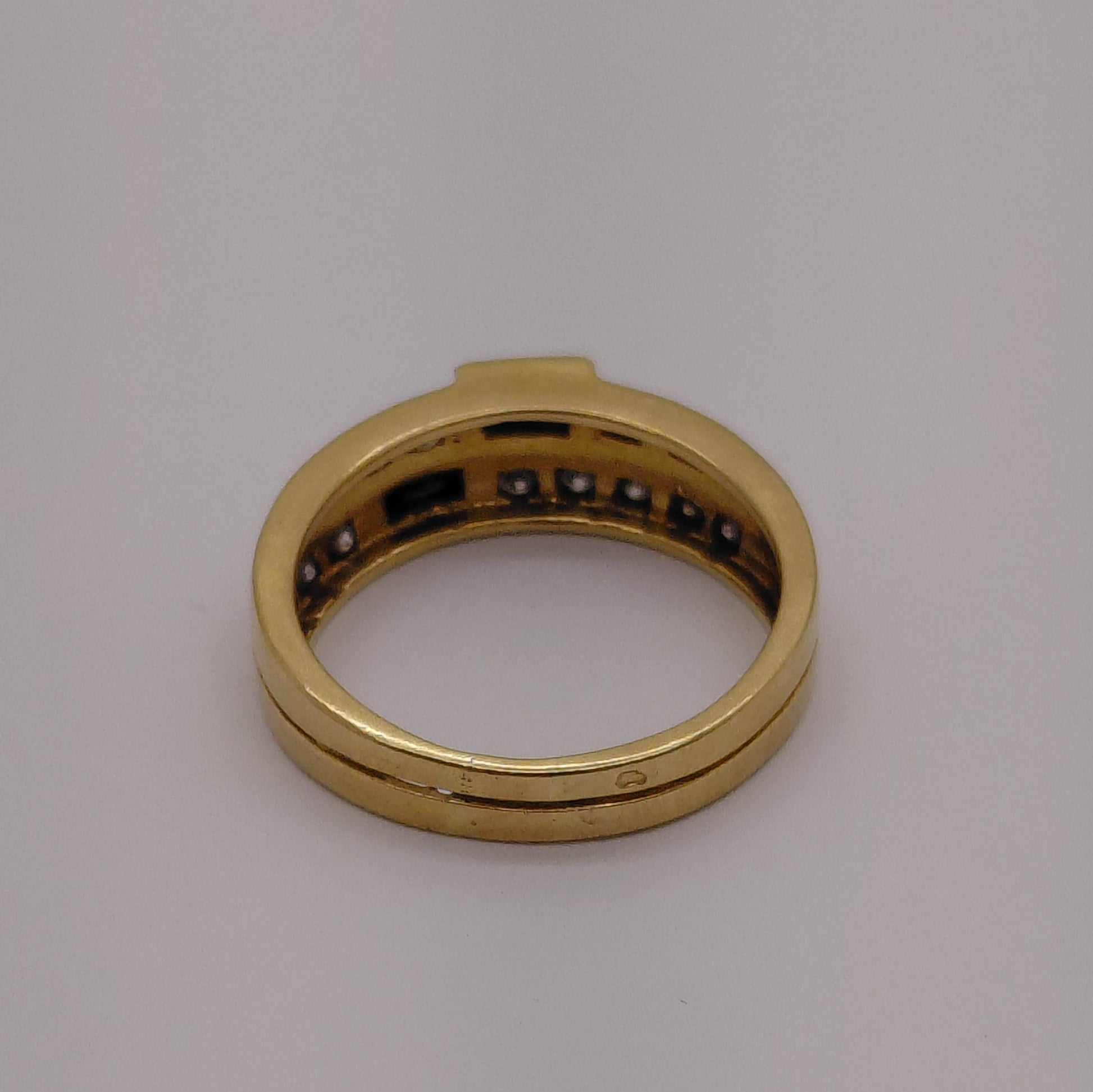Bague empierrée en or jaune 18 carats (poinçon tête d’aigle 916/1000), poids 4,69 grammes, taille 56. Elle est ornée d’oxydes de zirconium et se trouve en bon état.