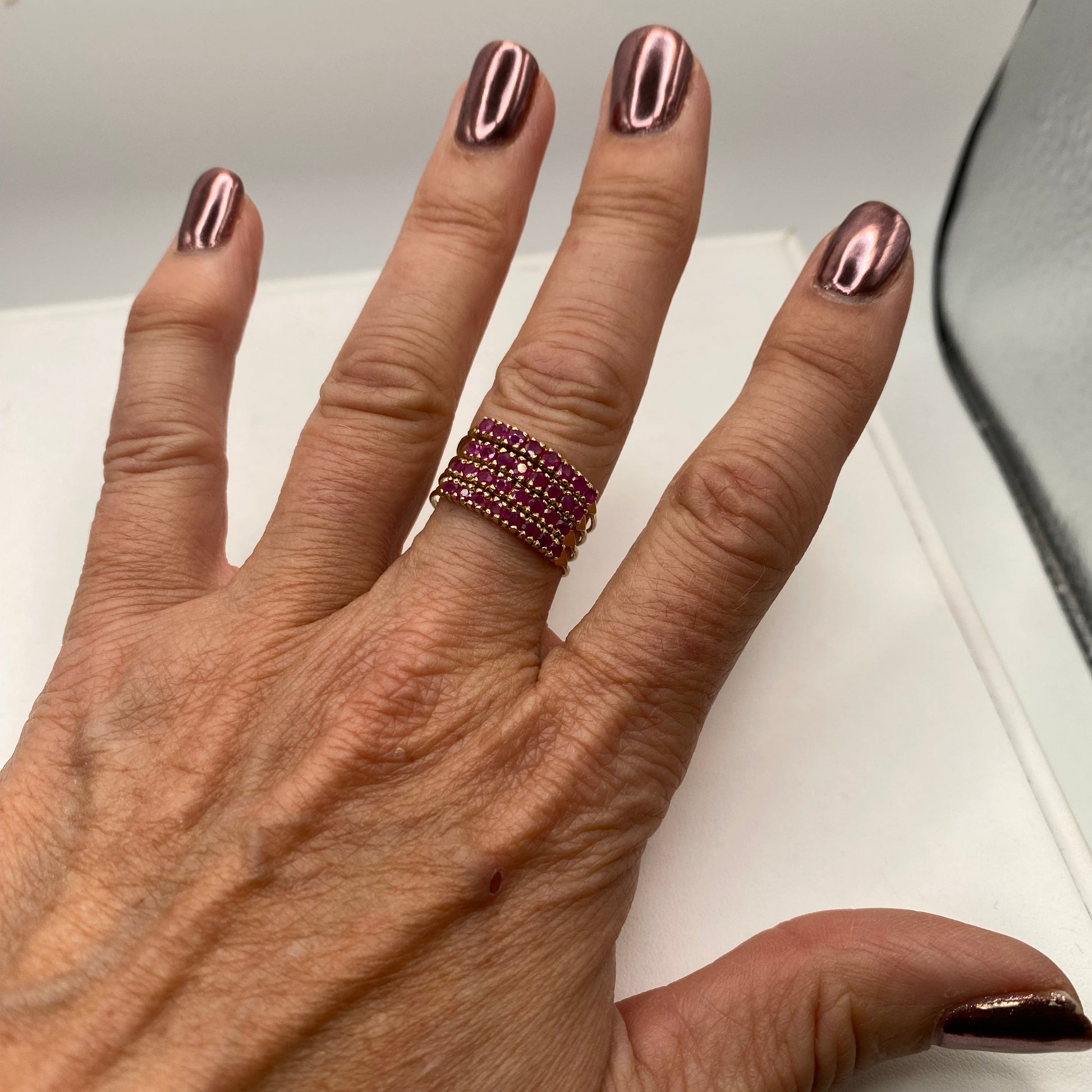 Cette bague en or 585/1000 est sertie de 32 petits rubis pour un éclat précieux. Avec un poids de 4 g et une taille 59, elle est en très bon état, idéale pour sublimer le doigt avec élégance et couleur.