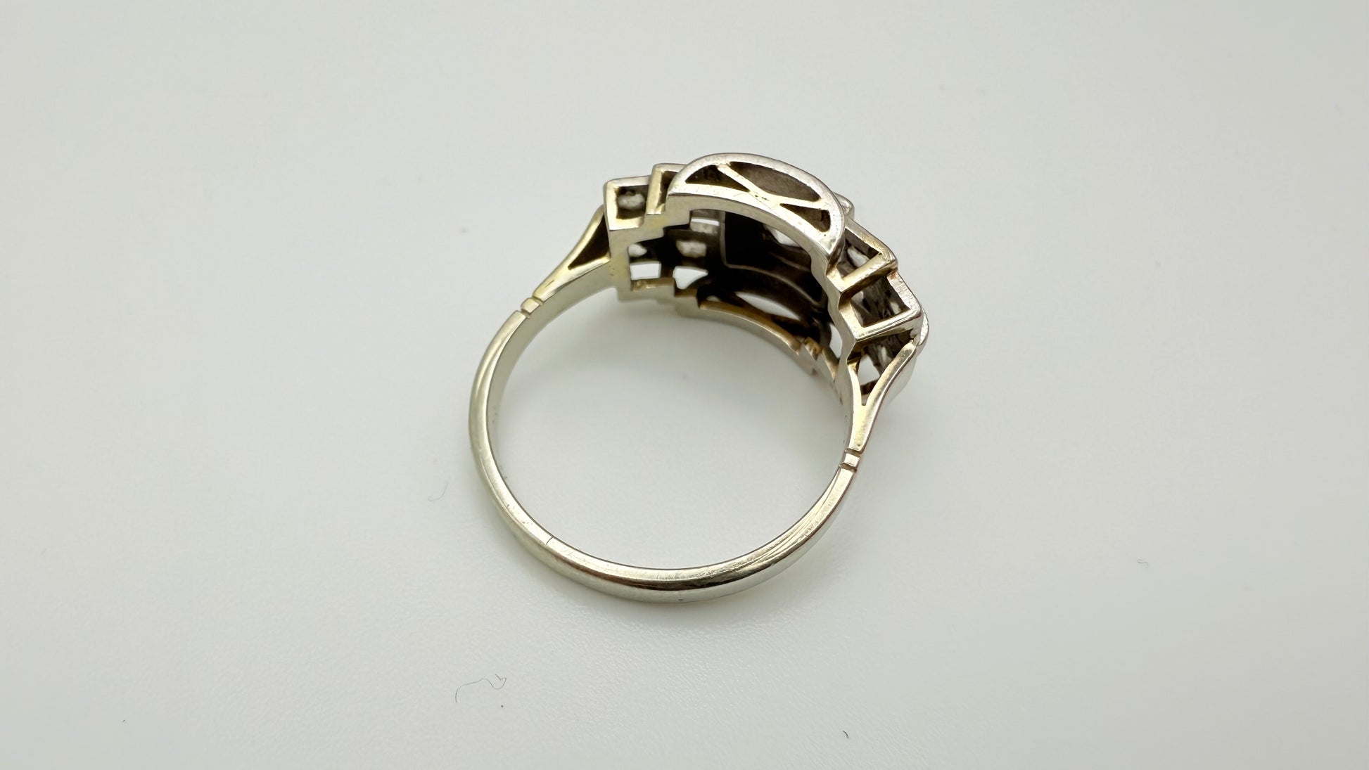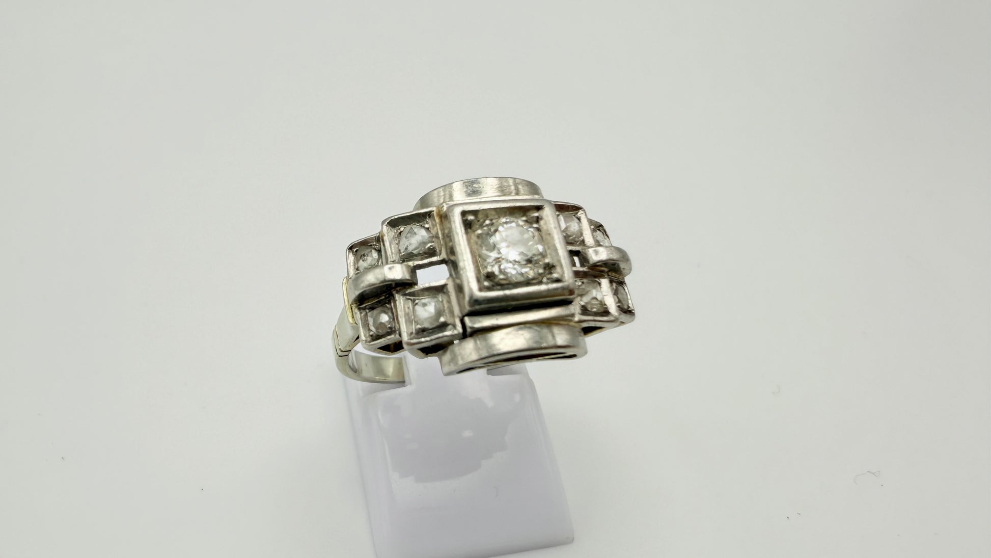 Bague empierrée en or blanc 18 carats (poinçon tête d’aigle 750/1000), de taille 56, ornée de 9 diamants. Poids : 5,53 g. Très bon état.