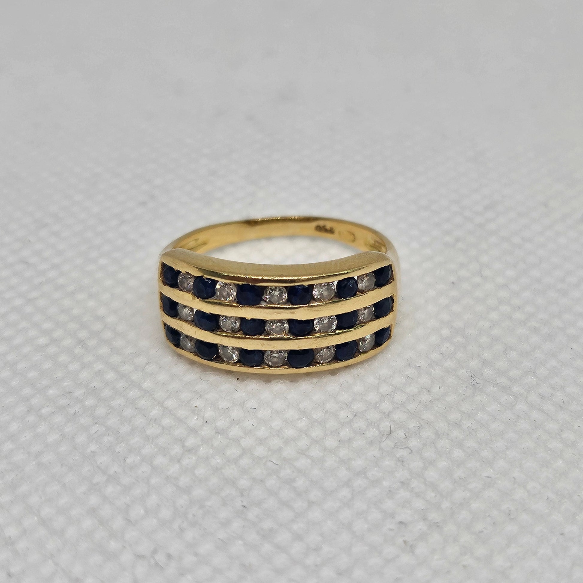 Bague empierrée en or jaune 18 carats, poinçon tête d’aigle. Taille 52, poids 3,54 g, sertie de saphir et de diamants, en très bon état.