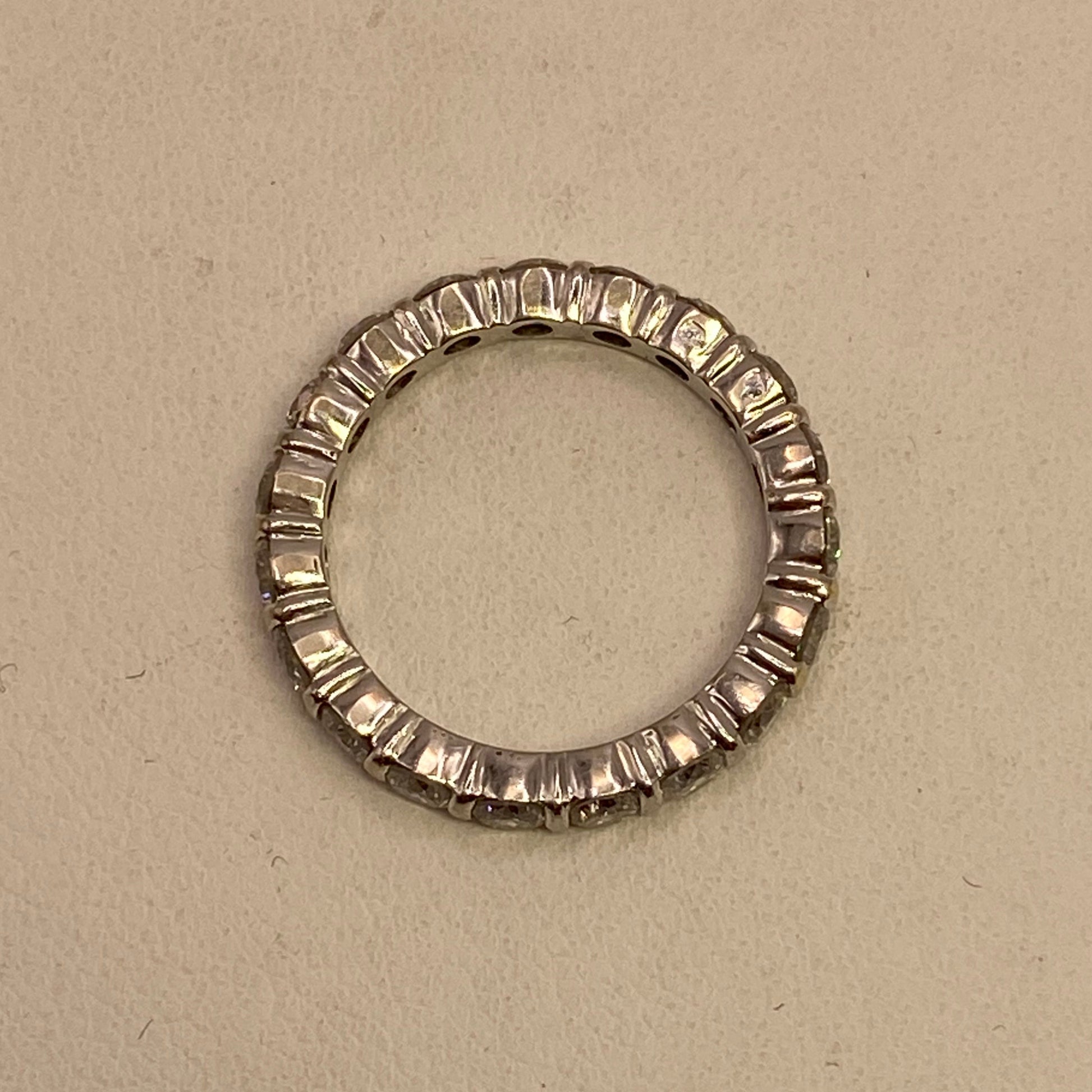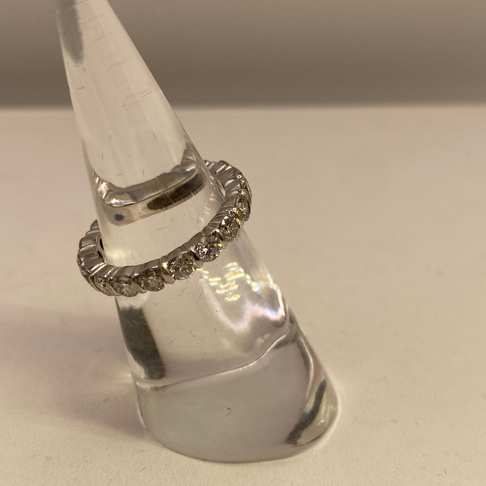 Bague tour complet en or blanc 750/1000 (18 carats), poinçon tête d’aigle. Sertie de 19 diamants de 0,05 ct chacun, soit ~0,95 ct au total. Poids 3,33 g. Taille 50. Très bon état.