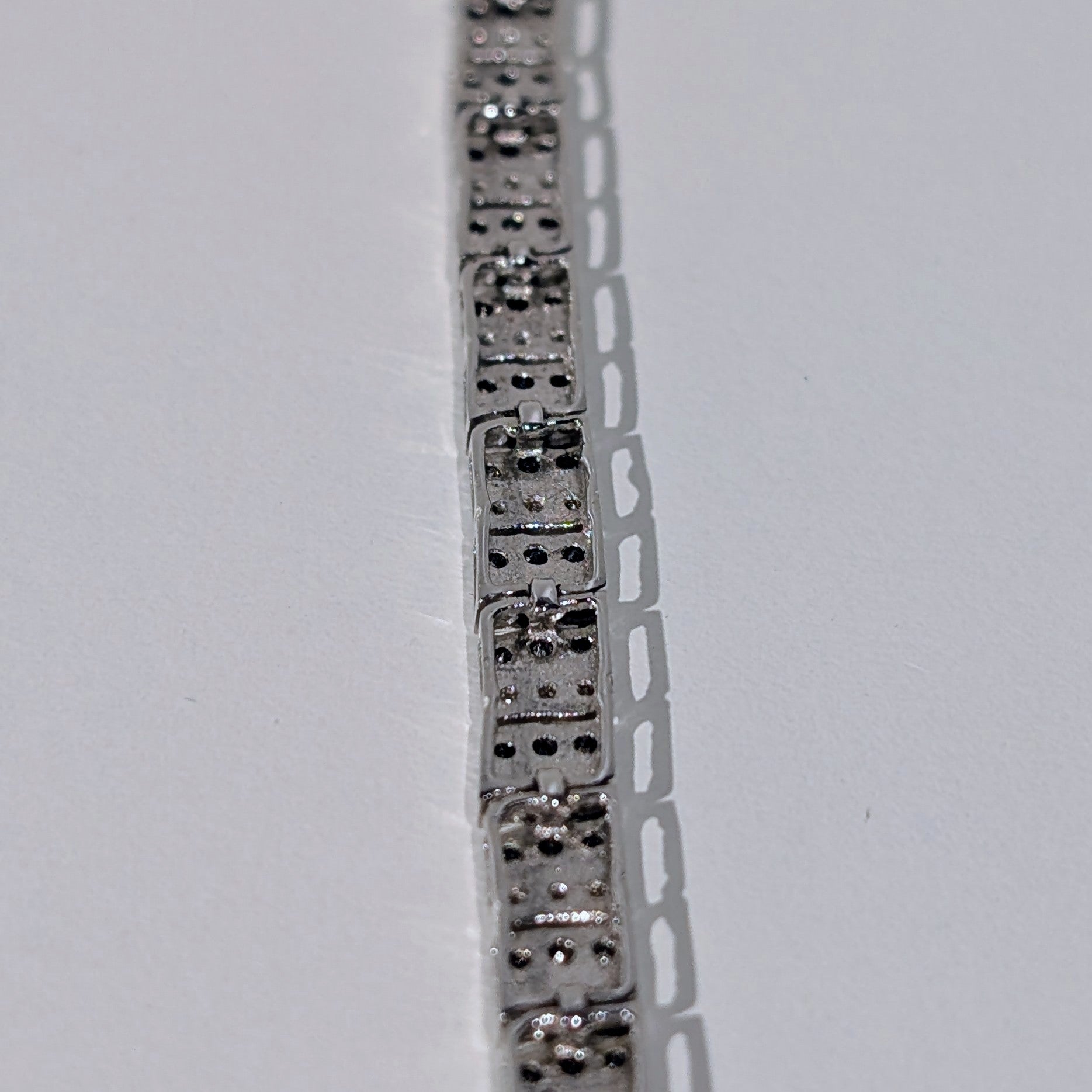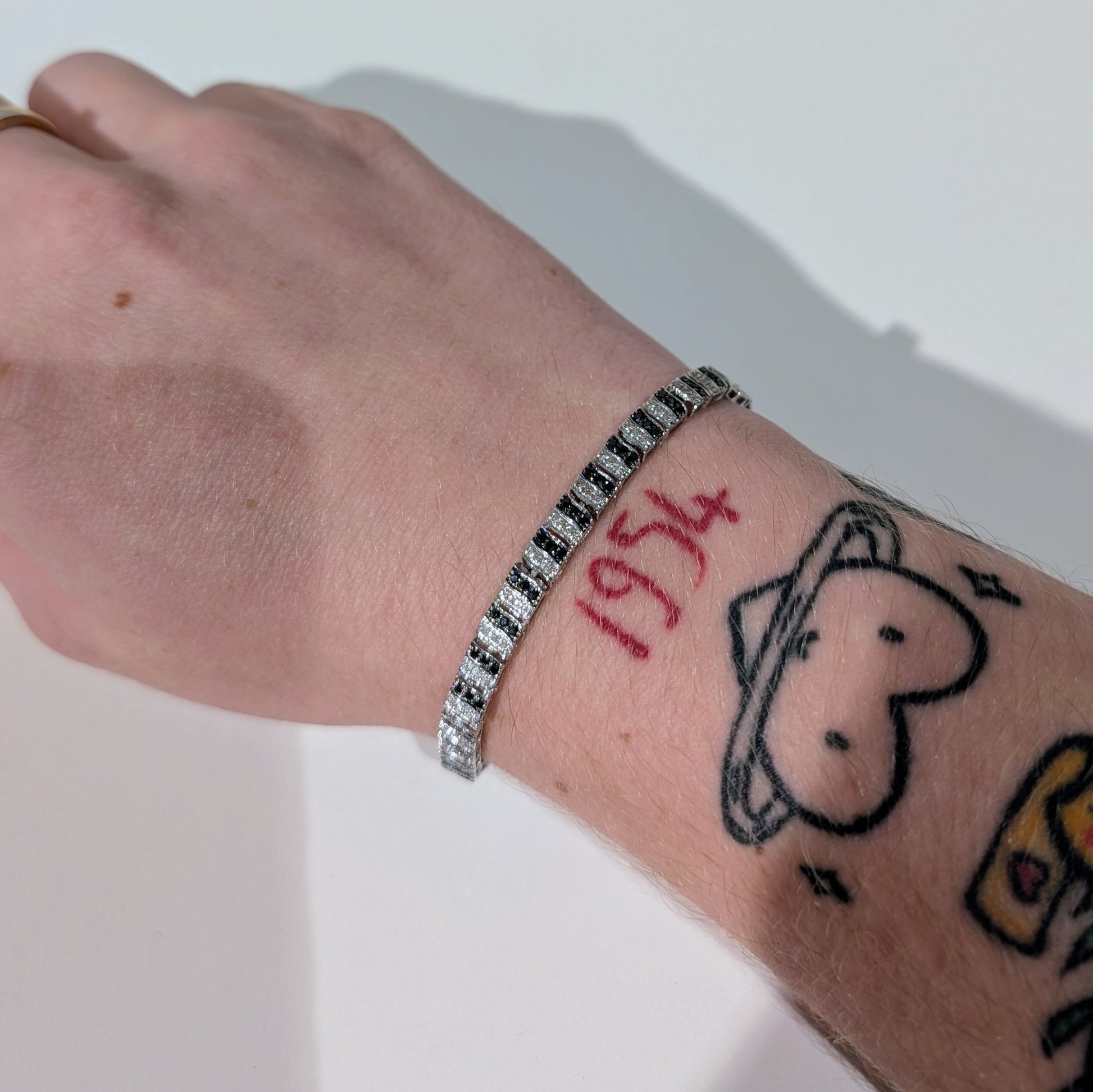 Bracelet à maillons fantaisie est réalisé en or blanc 18 carats (750/1000), identifié par un poinçon 750. Il pèse 8,34 grammes et mesure 17 cm de long, avec une largeur de 0,5 cm et une épaisseur de 0,2 cm. Fermé par un mousqueton, il est serti de 108 éclats de diamants et de 108 éclats de pierres naturelles noires. Ce bijou se trouve en bon état.