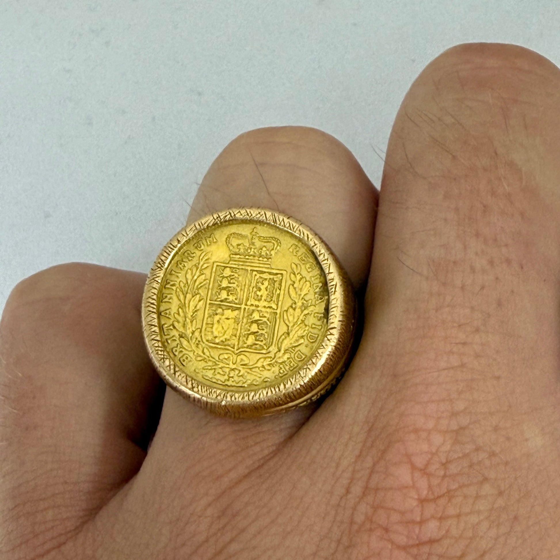Magnifique Chevalière en or 18 carats avec pièce britannique souverain Victoria jeune avec armoiries, variété plus rare.