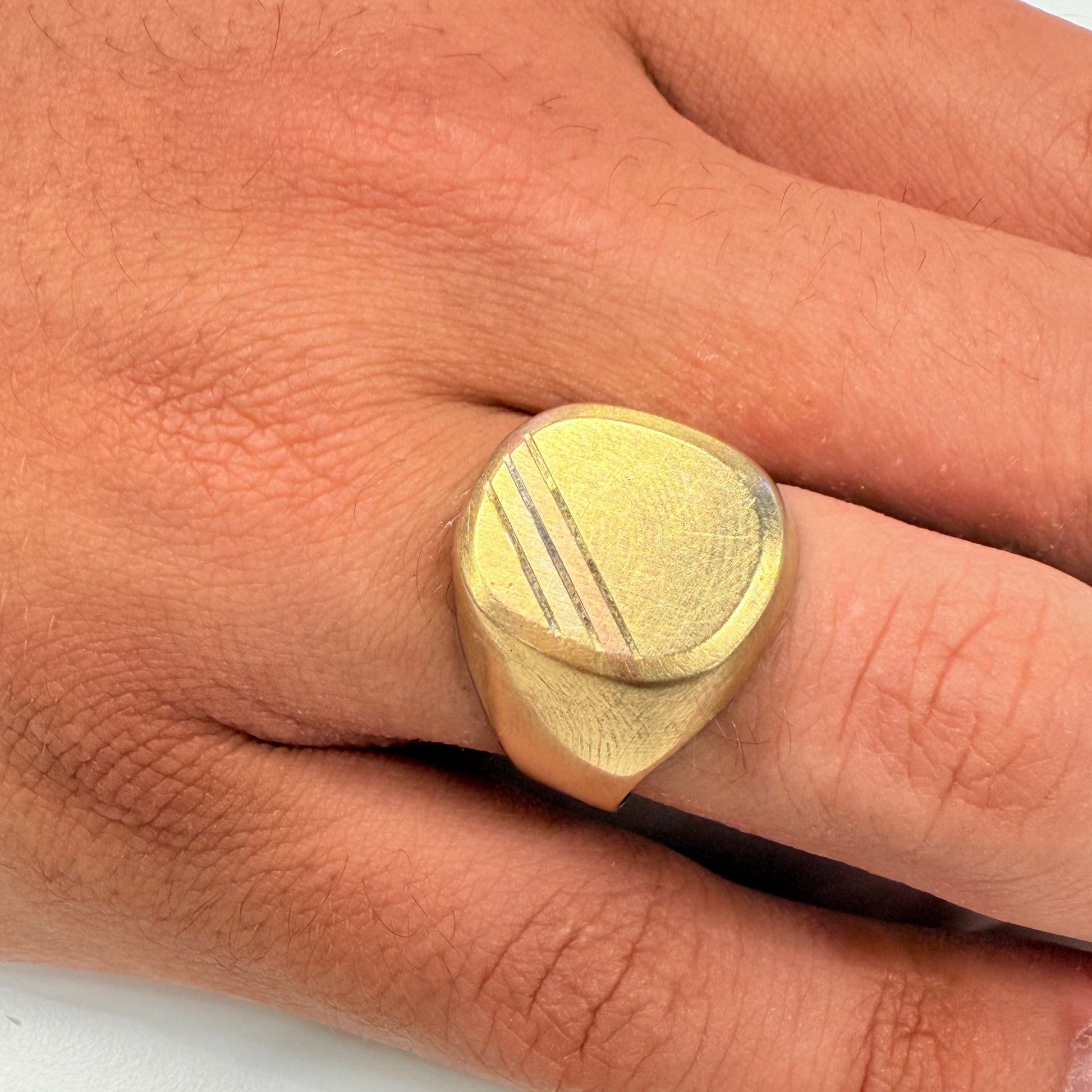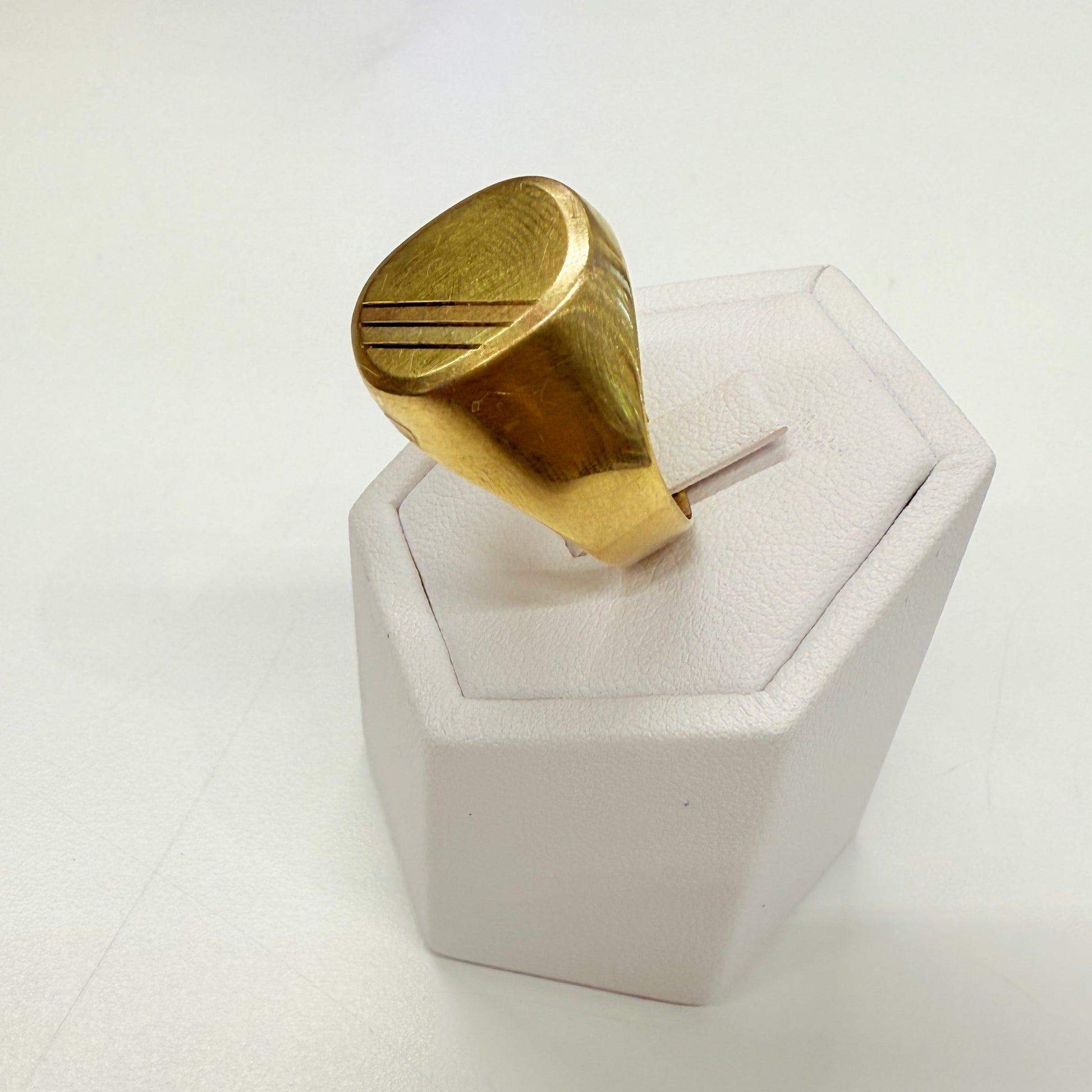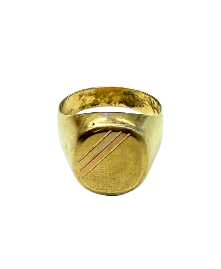 Chevalière tricolore en or jaune, or rose et or blanc 18 carats (750/1000), poinçonnée à la tête d’aigle. Elle pèse 7,17 grammes et correspond à une taille 64. Modèle sans pierres, présenté en très bon état général.