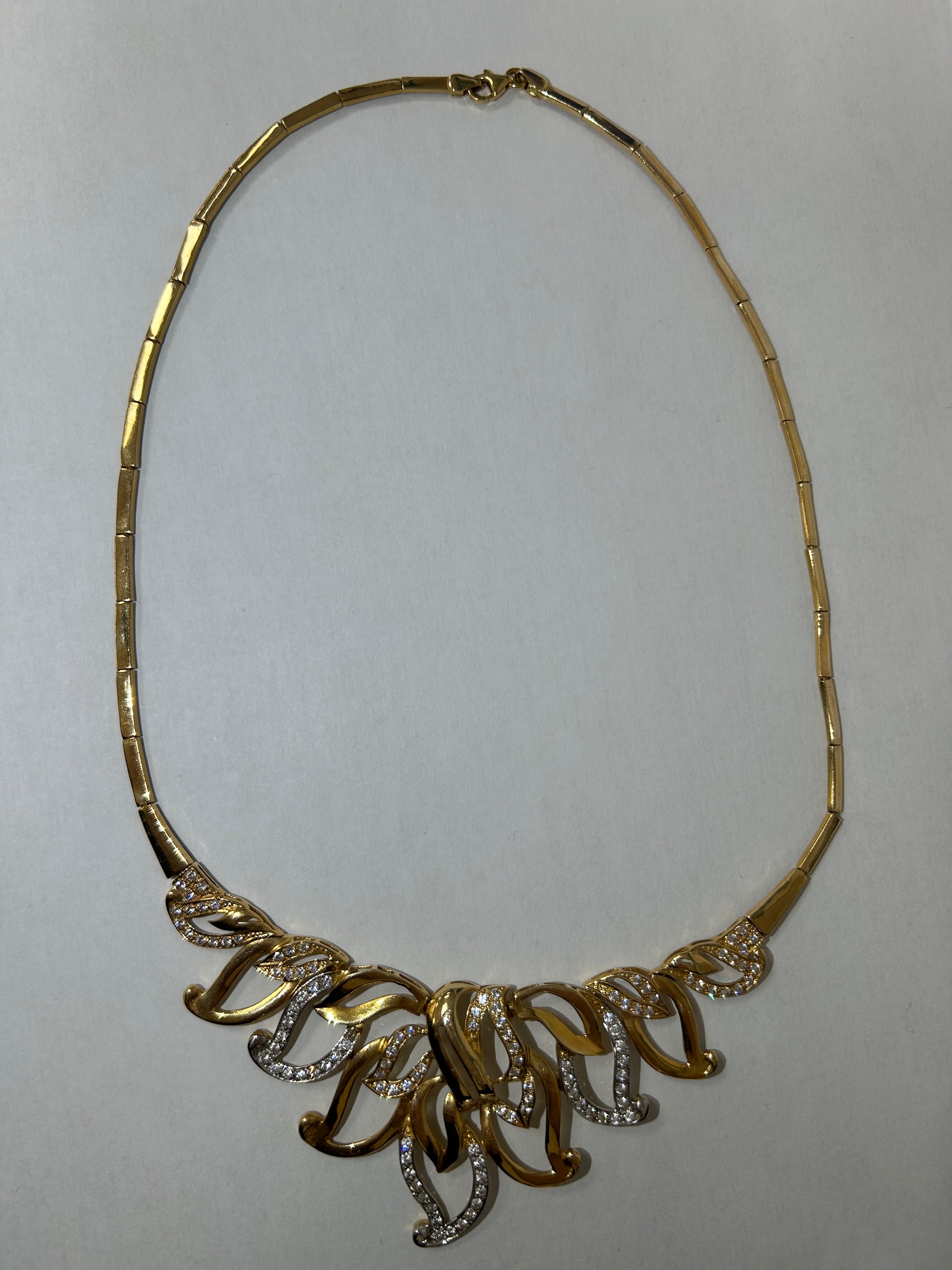 Collier ras du cou en or jaune 750/1000 (18 carats), maille miroir, fermoir mousqueton. Longueur 47 cm, largeur 21 mm, poids 25,34 g. Composé de 114 pierres. Bon état, sans poinçon.