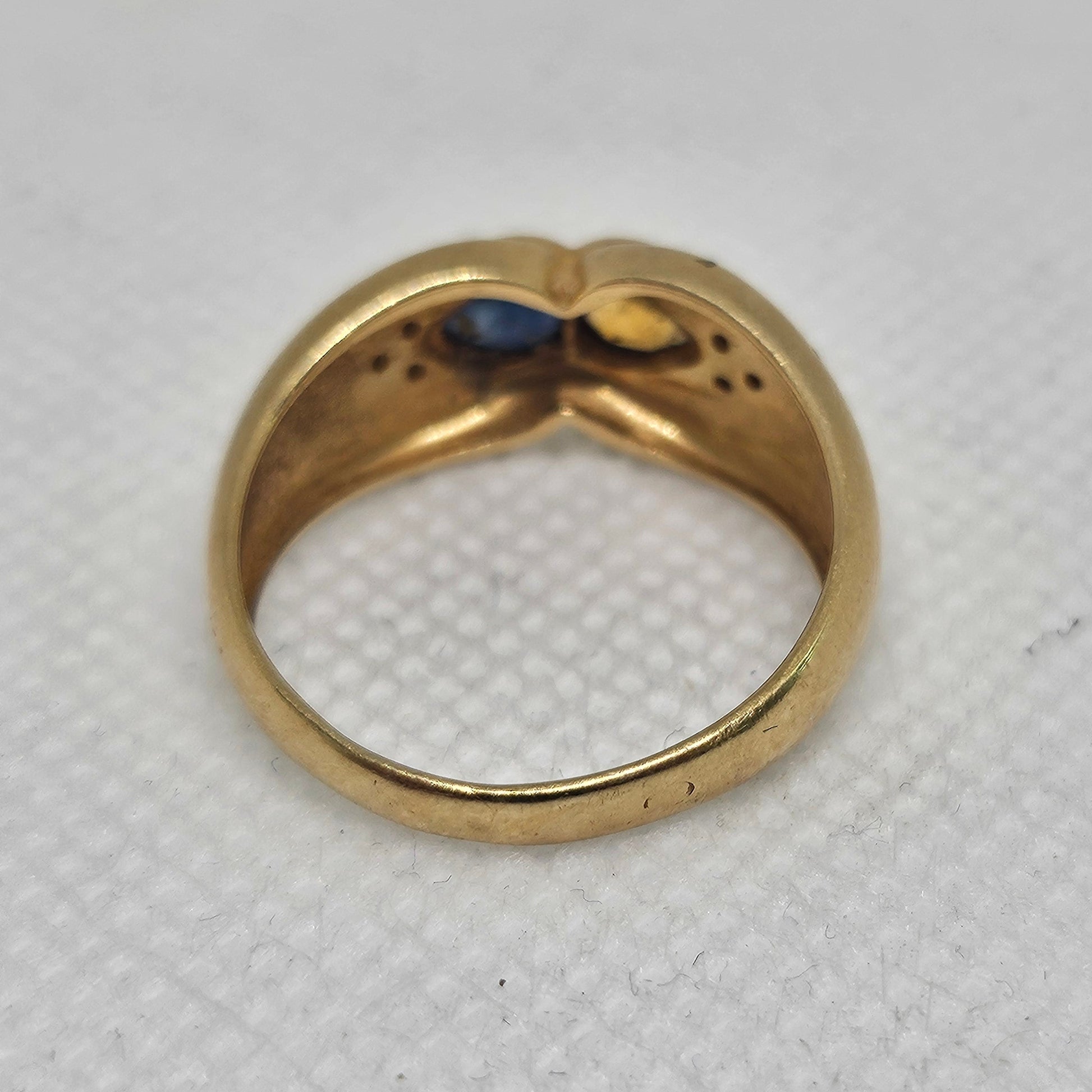 Bague empierrée en or jaune 18 carats, poinçon tête d’aigle. Taille 56, poids 4,74 g, sertie d’une citrine, d’un saphir et de 12 éclats de diamants, en très bon état.